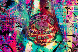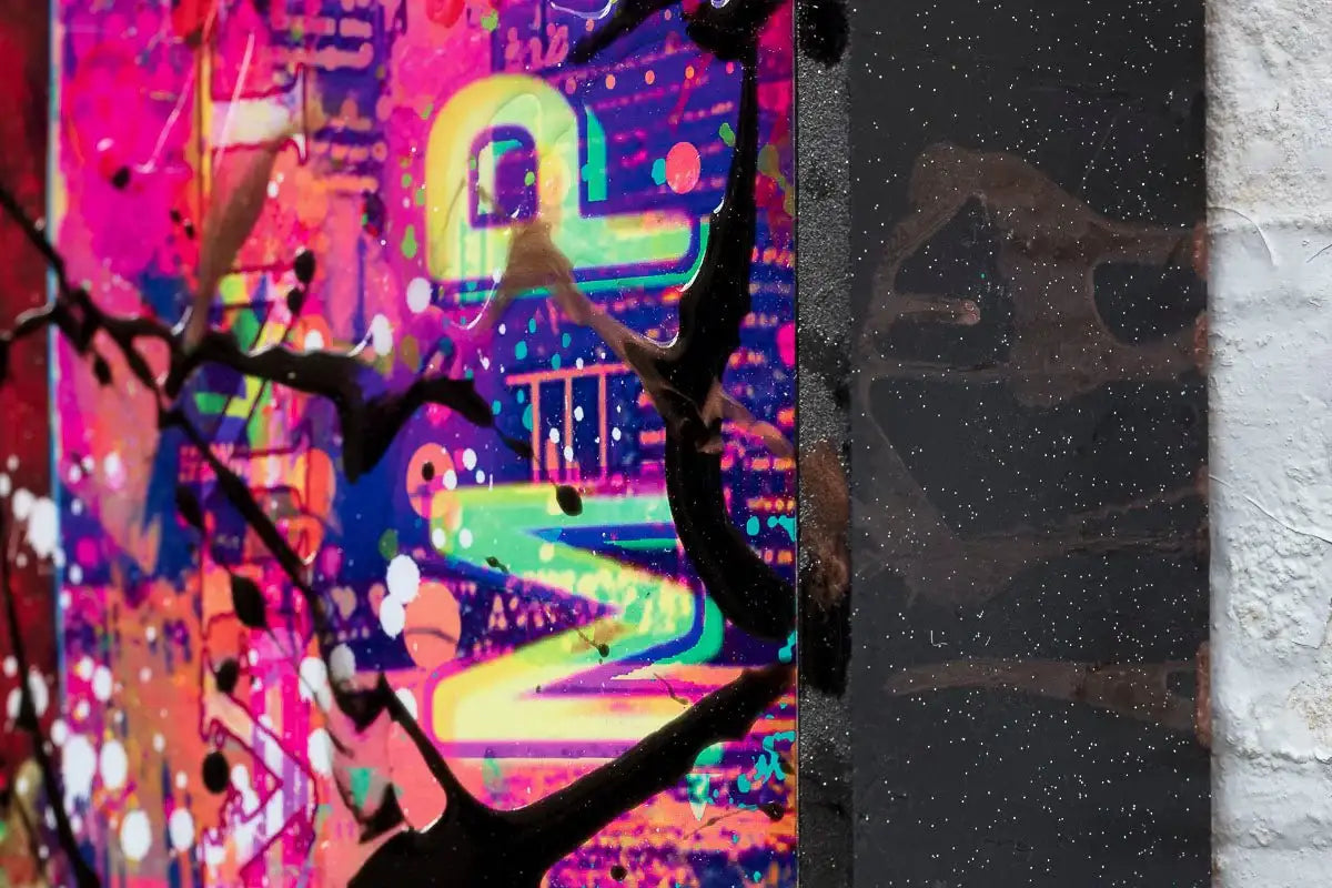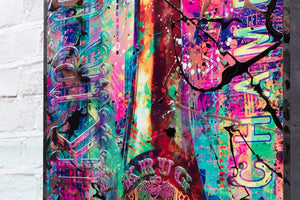 Discover the vibrant allure of City Never Sleeps, an original masterpiece by artist Henri Miller. This striking piece, crafted with mixed media on aluminium, combines print, oils, acrylics, and leaf, all sealed with a glossy resin finish.