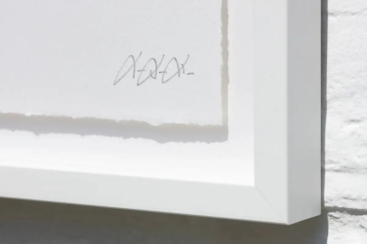 Upon arrival in our Weybridge showroom, each new arrival is examined by the studio & dispatch team. Frames are scrutinised for a perfect finish: glass is polished to perfection with anti-static art cloths. Auxiliary features like the string/wire and certification on the reverse are checked for positioning and correct mounting. Finally, the work itself is inspected to ensure a flawless transition from studio to gallery. Upon purchase, the work is cleaned again and meticulously subjected to our trademark 12-point checking system to ensure a safe secure journey to its ultimate destination.