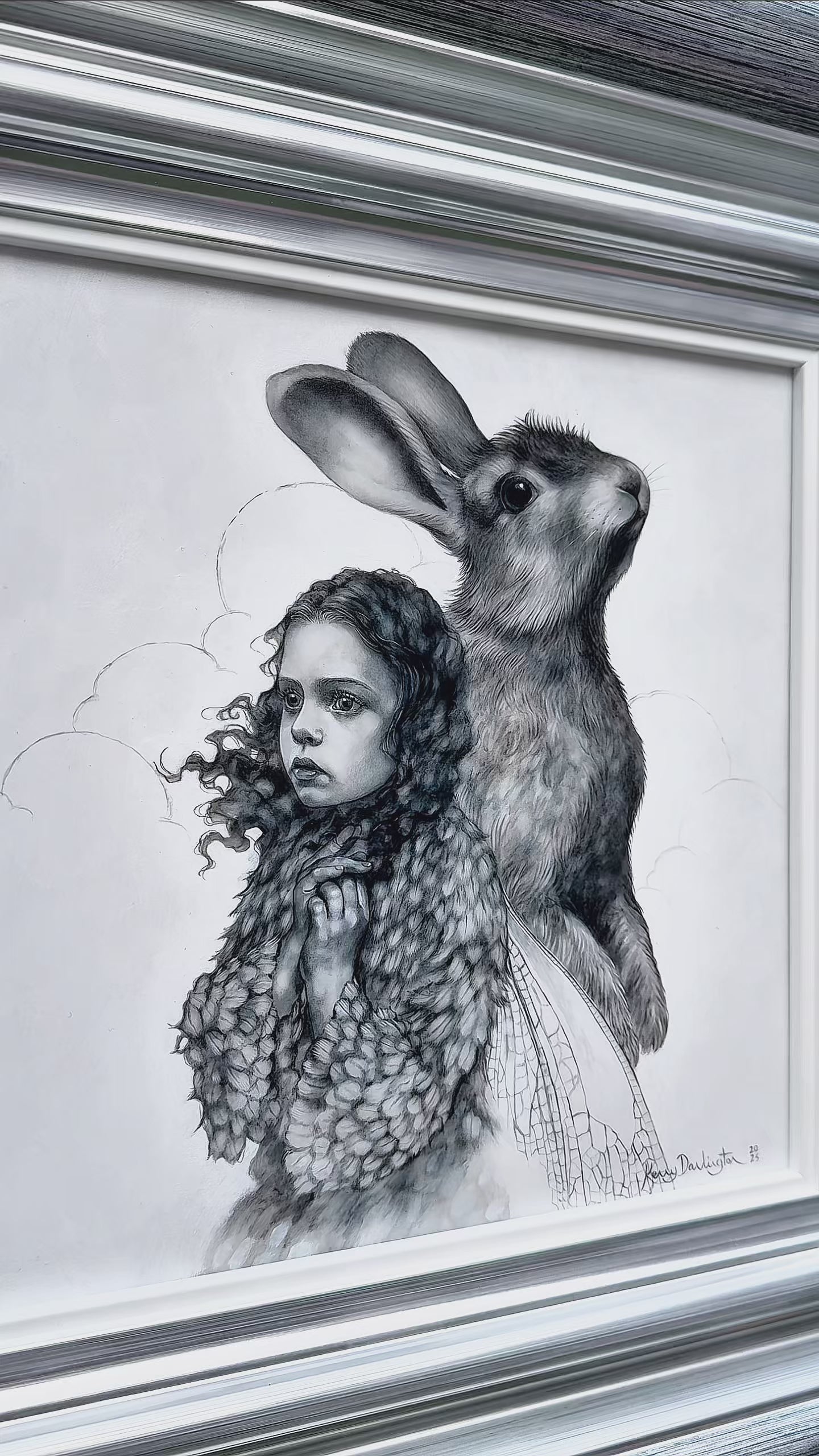Kerry Darlington’s 'Elfenwald' takes its name from a word the artist describes as “charming”; a term for an enchanted forest where elves are said to dwell. In this mystical woodland world, a small elf-like child stands beside a watchful hare, their expressions poised between wonder and melancholy. Together they embody the stillness of nature and the quiet companionship found in magical places.