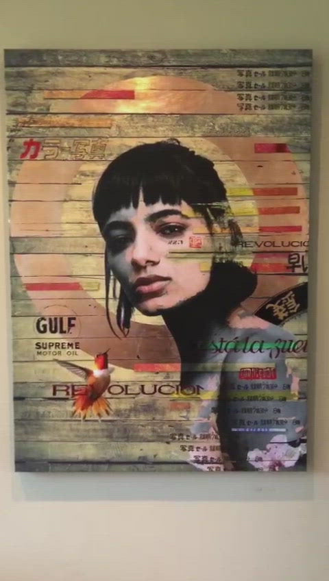 • Medium: Limited Edition giclée printed canvas combining digital and traditional design with hand applied techniques in the application of gold leaf and acrylics. This piece also incorporates 3D offset lacquered tiles with authentic Japanese postage stamps.