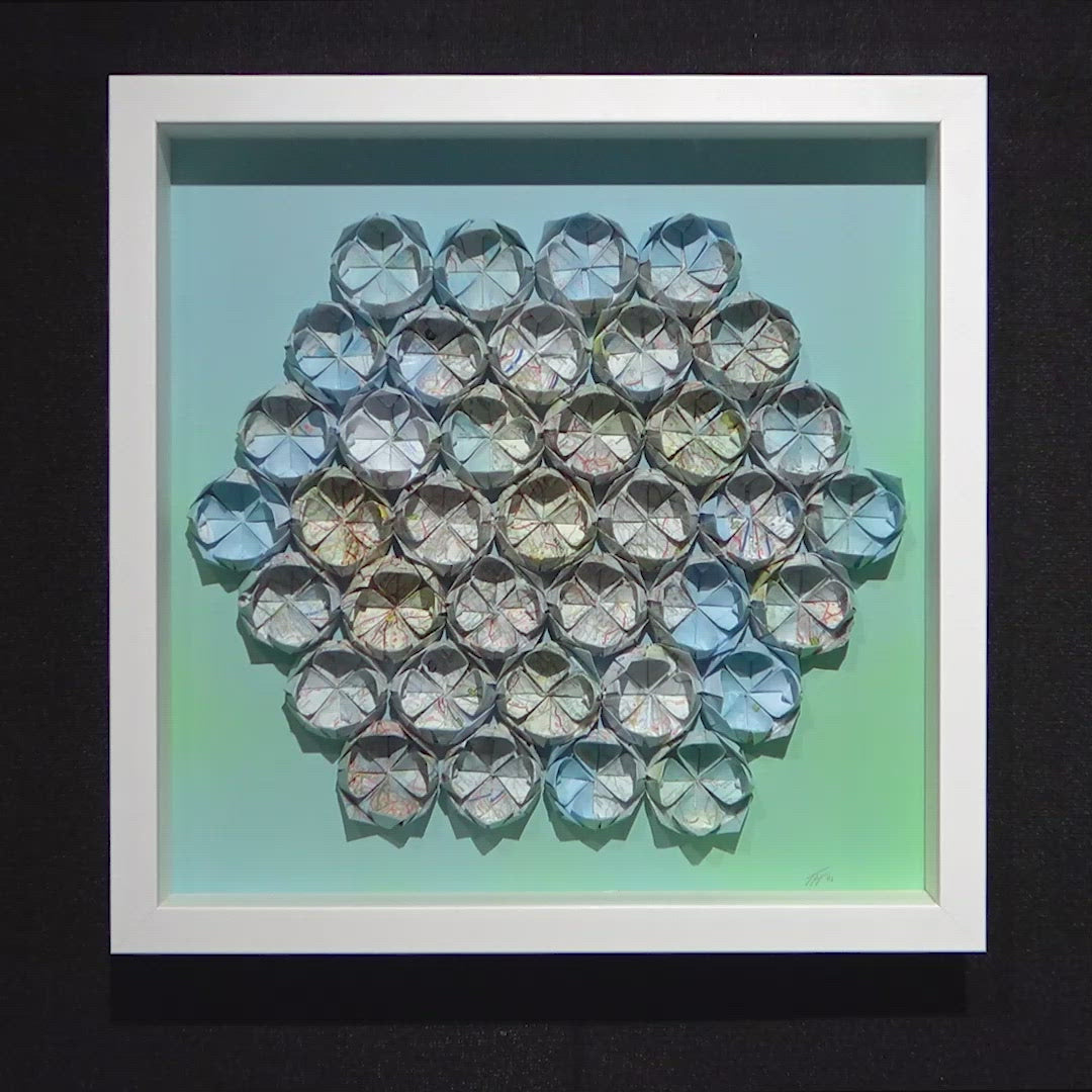 • Medium - Spray painted Origami paper lotuses folded from reclaimed maps, a patchwork of colour each folded for an unexpected contrast between land and sea.