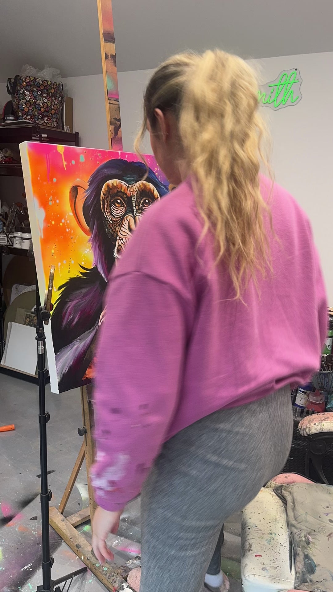 Her distinctive techniques, including layering acrylic paints and aerosol sprays with metallic leaf on canvas. Smith's use of UV-reactive pigments transforms her artworks from day to night, offering a glowing second life after dark. Exclusively available at Wyecliffe Galleries.