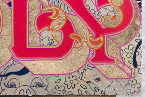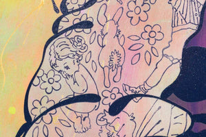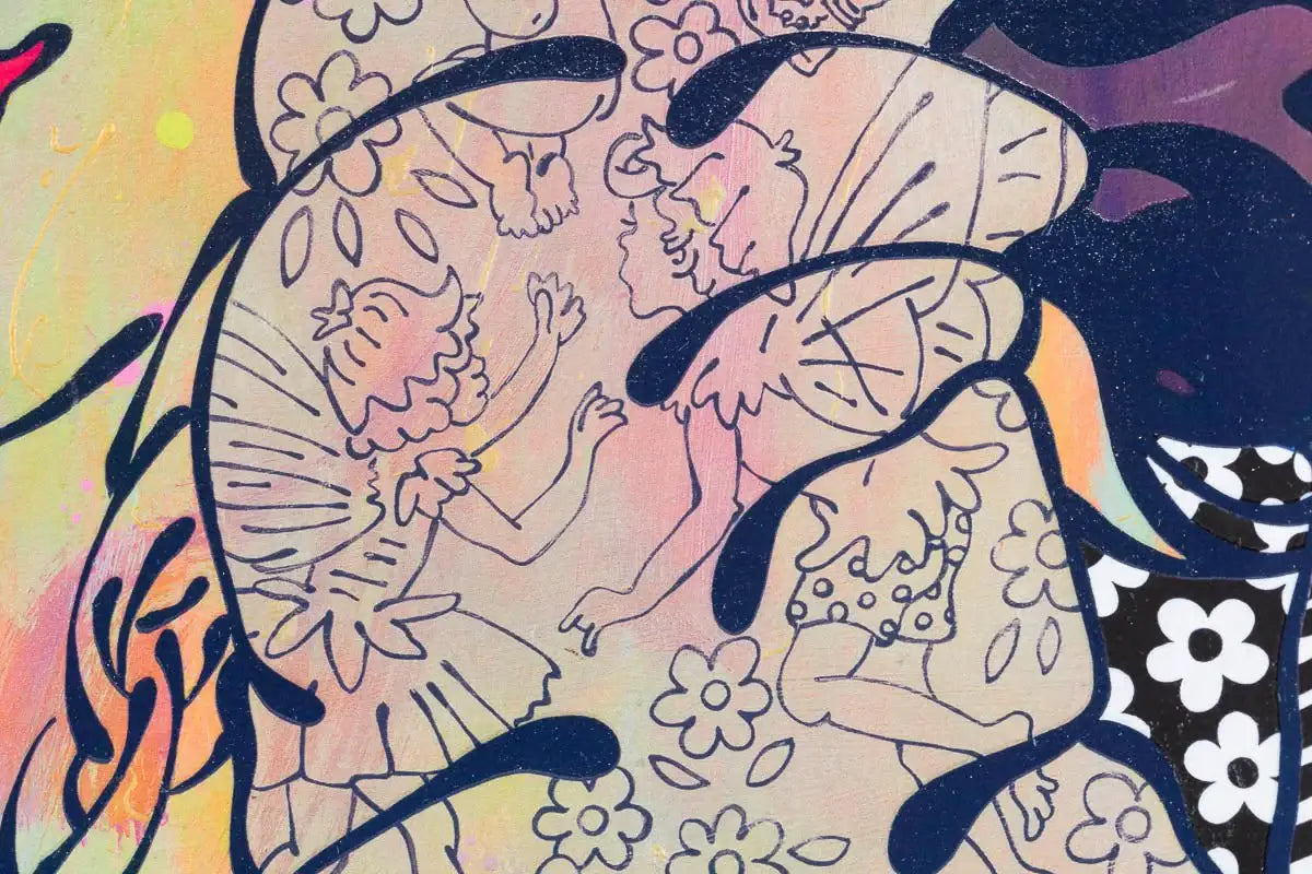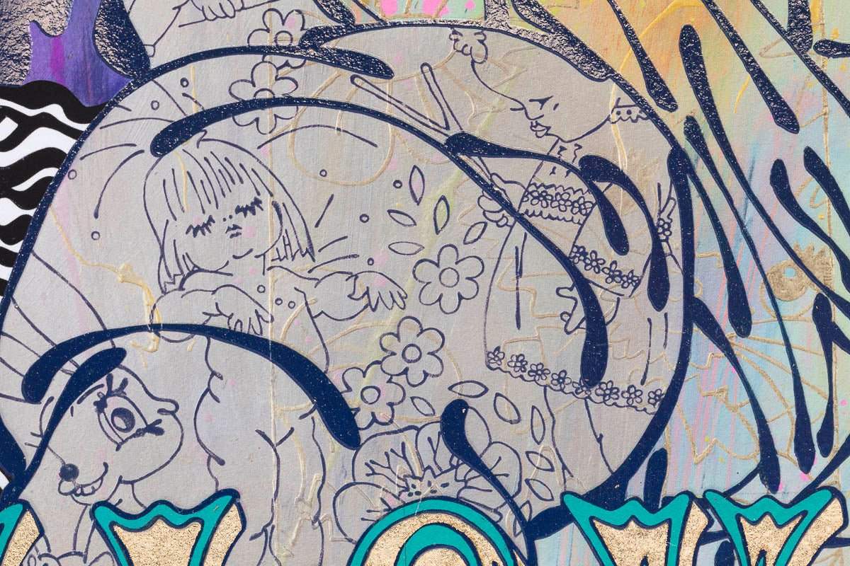 'This painting is my personal favourite. Inspired by my daughter, Lama, this work layers personal memories and emotions. Splashes of sunshine and golden sunsets form the backdrop while cute creatures like fairies, gum nut babies, bunnies and robins, weave their way through the intricate layers. This piece offers endless amusement and conversation, as you try to spot the storybook characters." - Louise Dear