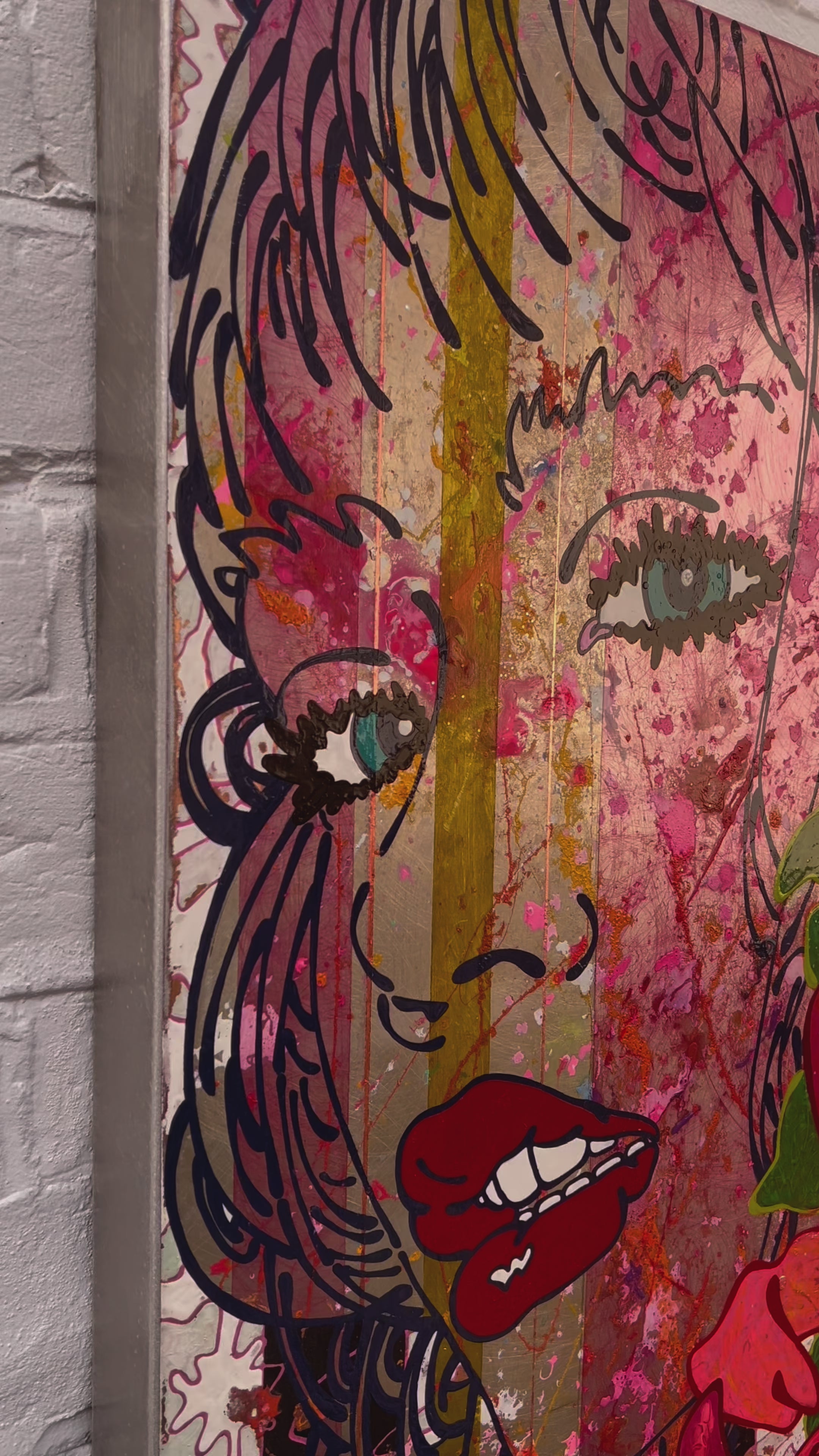 'Twins with a single pulsing heart gazing out from the canvas with 'knowing innocence'. They have the same intricate curls and glossy, plump red lips, only different-coloured eyes of piercing blue and teal suggesting that they are, in fact, independent beings. I first coated the background in copper leaf, carefully occupying all of the negative spaces to allow the image to pop from the canvas as though the decapitated forms are simply floating in space. This luscious leaf was then covered in my signature black and white stripes, rendered in contrasting textures, mattes and glosses in an intricate design of Japanese inspired blossom. The petals' independent form appears as butterflies or other creatures that inhabit the blooming buds. The paint has then been softly sanded back to allow the under layers to protrude giving the viewer glimpses of the inner depths and the shimmering lushness of the copper leaf. Look closely at the lush petals of the peony and you'll also spot small images and stickers that have been encapsulated inside the sealed bubble of the varnish - all symbols of my world, flamingos, sunshine and sparkles.'