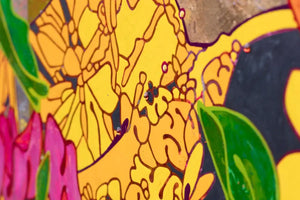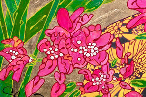 'A gorgeous explosion of blossoming blooms produced on layer upon layer of deliciously vibrant colour on a backdrop of luscious gold. What a sumptuous feast! In this new work, I wanted the plants to gain more prominence and as my practice has evolved, I'm now focusing more on depth of texture and strength of colour. Each individual petal is worked on, every section overlaid with more paint, then gently sanded back so what was once below can peep through. My works are as multi-layered as are we. A reflection of the lives we have led, the paths we have chosen, the trauma we have experienced. How our loves and losses and all of life’s deliciousness and despair continue to influence the people we become.'