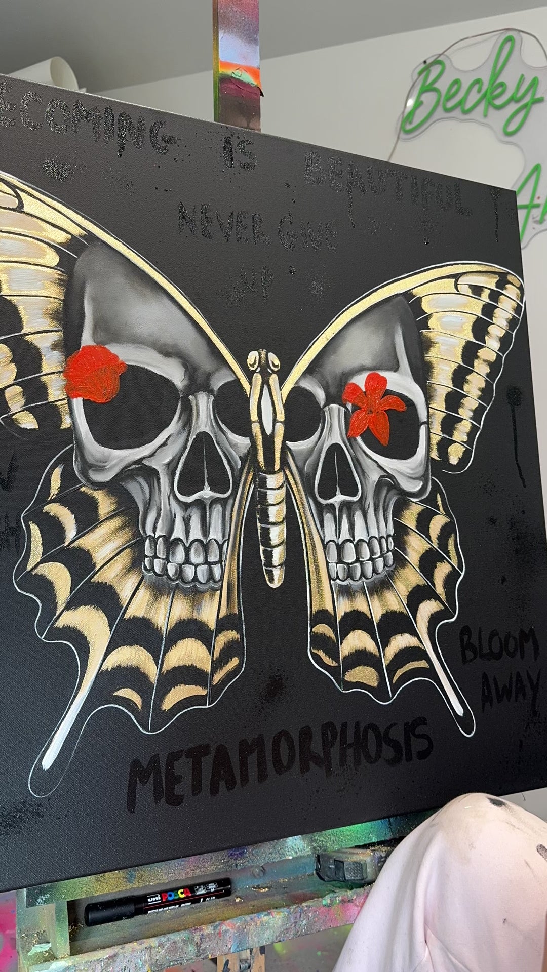 Becky Smith has rapidly emerged as a key figure in contemporary art, captivating collectors and enthusiasts worldwide with her signature skull motifs, adorned with intricate flowers, climbing vines, butterflies and bees. Combining vibrant natural elements that appear to grow from within, evoking life, beauty, and transformation.