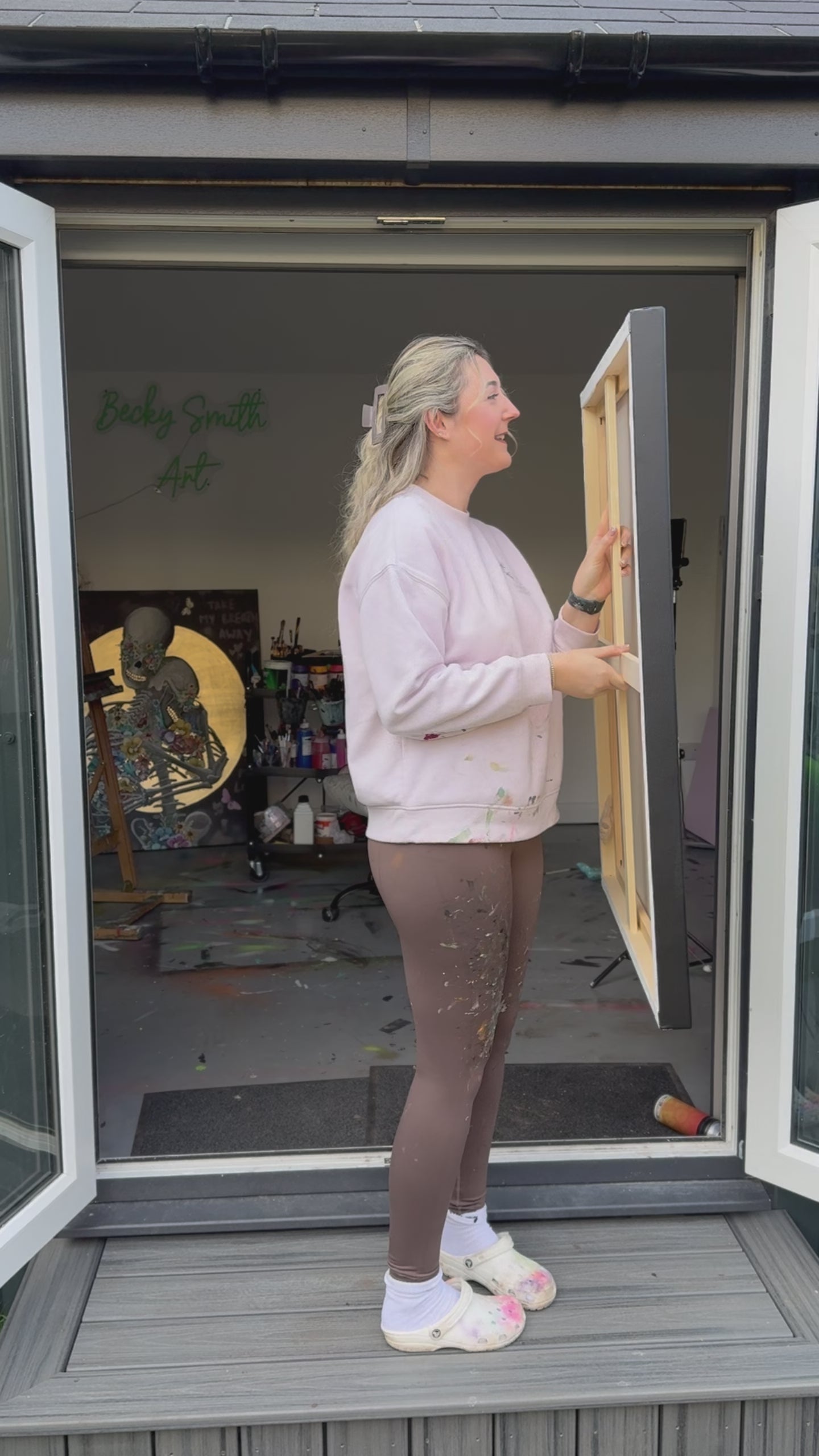 Crafted in acrylic and spray paint, and finished with UV-reactive and glow-in-the-dark pigments, the piece transforms under light, offering a dynamic viewing experience from day to night. Measuring 100 x 80 cm, this powerful composition brings Becky’s signature style; colour, graffiti, glamour and meaning, to full-size glory.