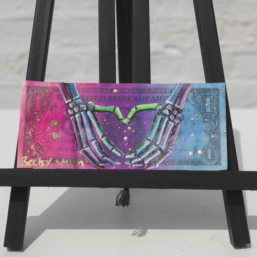 Each piece in Becky Smith’s American Dream series transforms an authentic $1 bill into a hand-painted miniature original, playful, powerful, and totally collectable. Whether it’s skeletons kissing, boxing gloves swinging, butterflies with skulls or a rainbow-drenched Lamborghini, every note is a one-of-a-kind statement fusing money, identity and imagination.