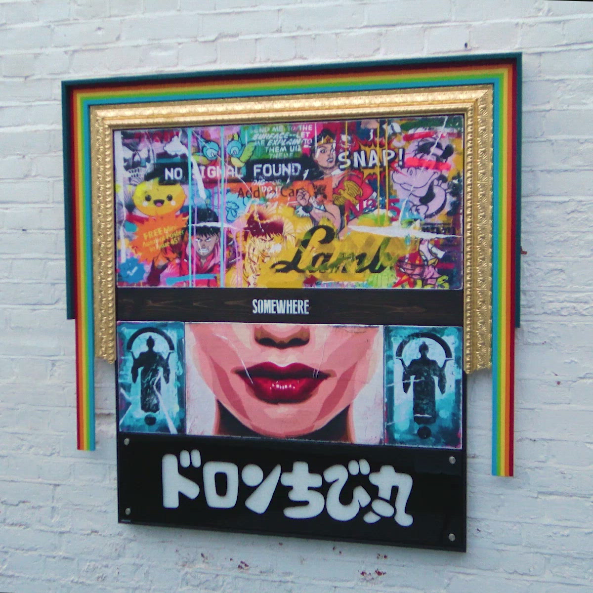• Medium: Mixed media - multi canvas composition, featuring torn, pasted & layered paper print works, coated in UV protective high gloss varnish, chrome bolted windowed perspex relief, over diamond dusted panel.