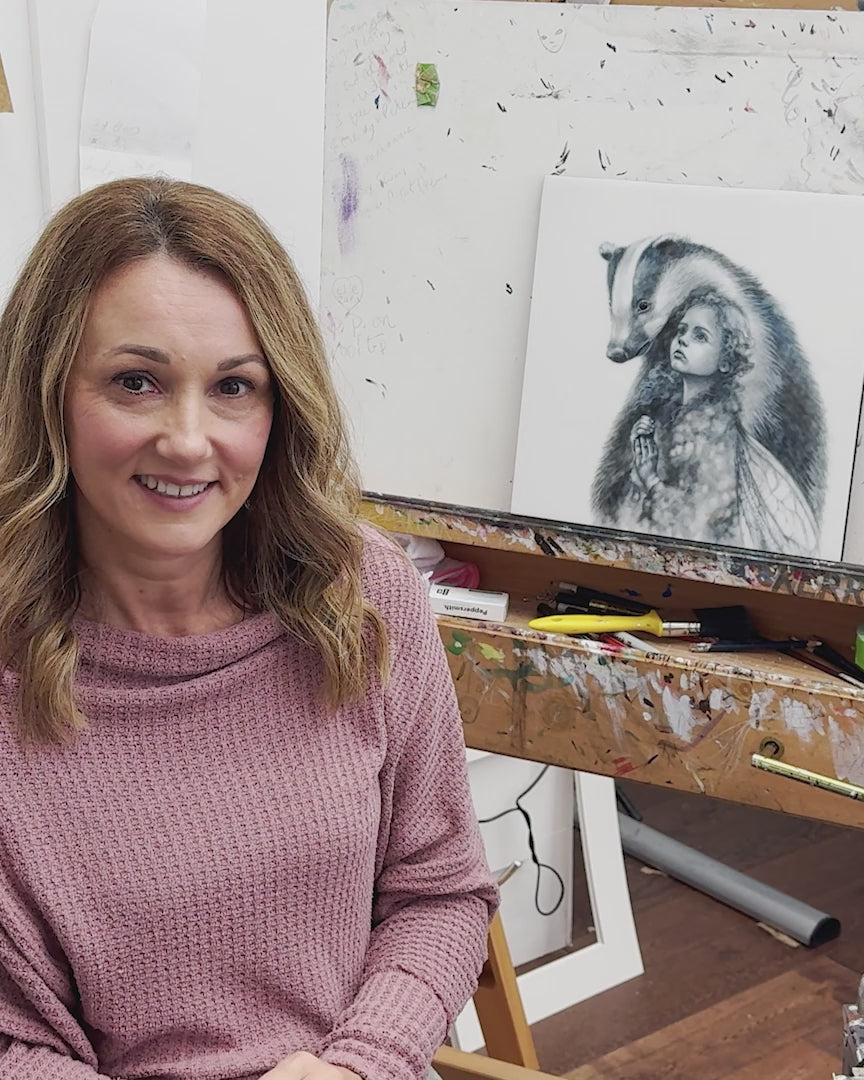 This is the Badger Faerie.. she is to be found in Neverland and she lives in wildwood in Neverland and probably only comes out at night with Mr Badger. For this piece I have used the limited palette of blues with a smoky black and a touch of white. I wanted to keep with the Peter Pan theme and the new piece ‘Second Star to the Right and Straight on Till Morning’, which is very smoky in atmosphere so I was trying to capture that. – Kerry Darlington