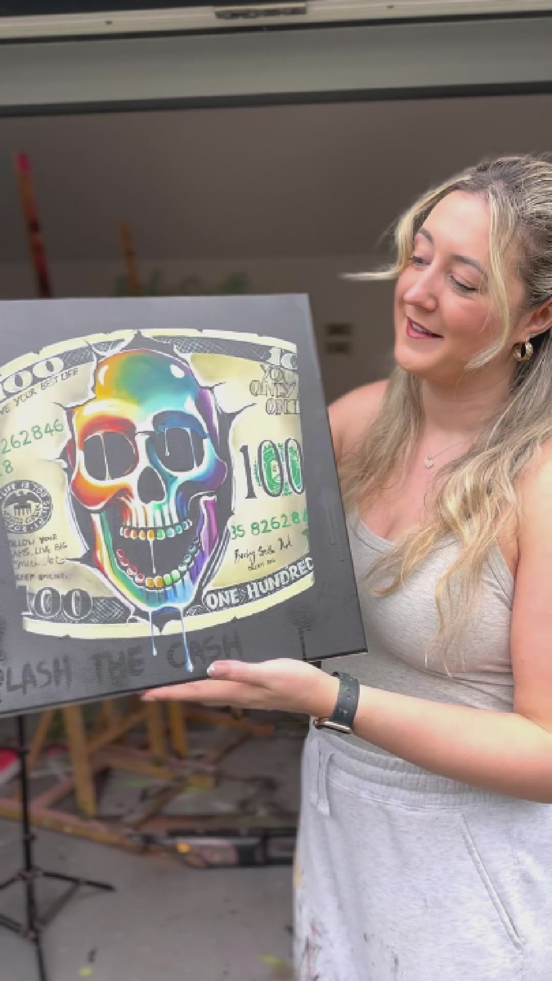 Break the Bank is Becky Smith’s unapologetic take on money, mortality, and the art of living loud. Featuring a rainbow skull bursting through a ripped $100 bill, this 40 x 40 cm original canvas combines humour, hustle and a message that hits hard: Follow your dreams. Live big. Keep smiling.