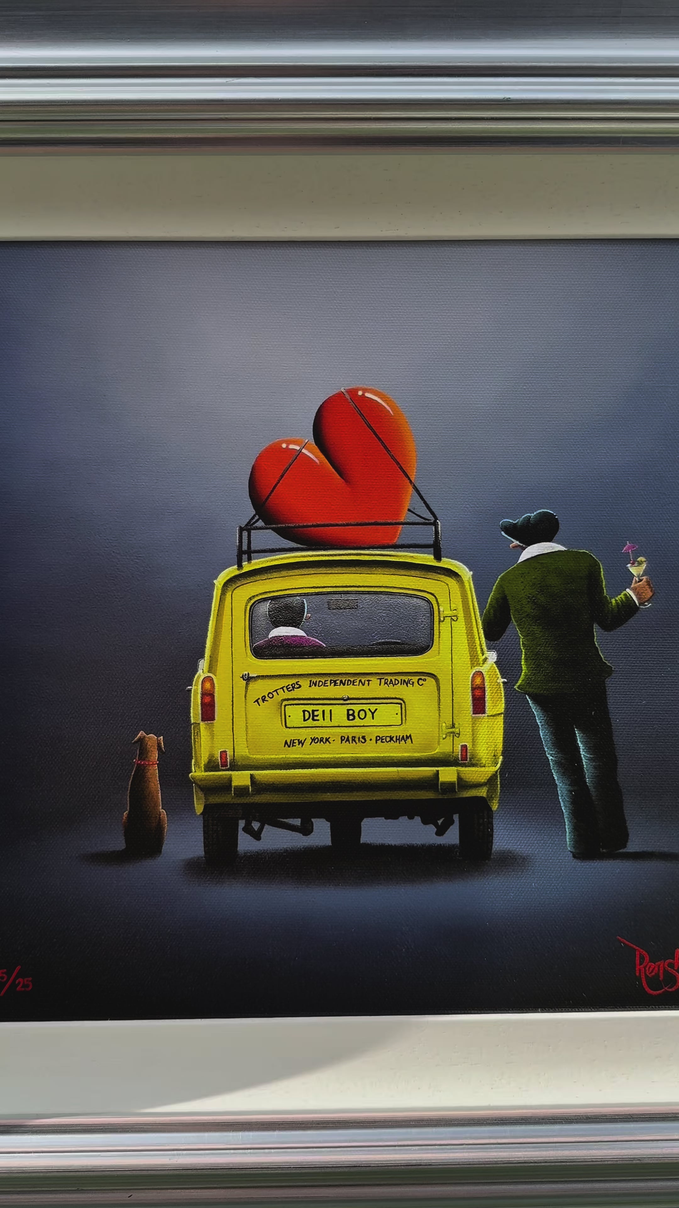 Step into the world of British nostalgia with David Renshaw's boutique edition piece, 'This Time Next Year, We'll Be Millionaires'. Inspired by the beloved sitcom 'Only Fools and Horses,' this artwork captures the charm and humour of the iconic yellow three-wheeler, making it a must-have for fans and collectors alike.