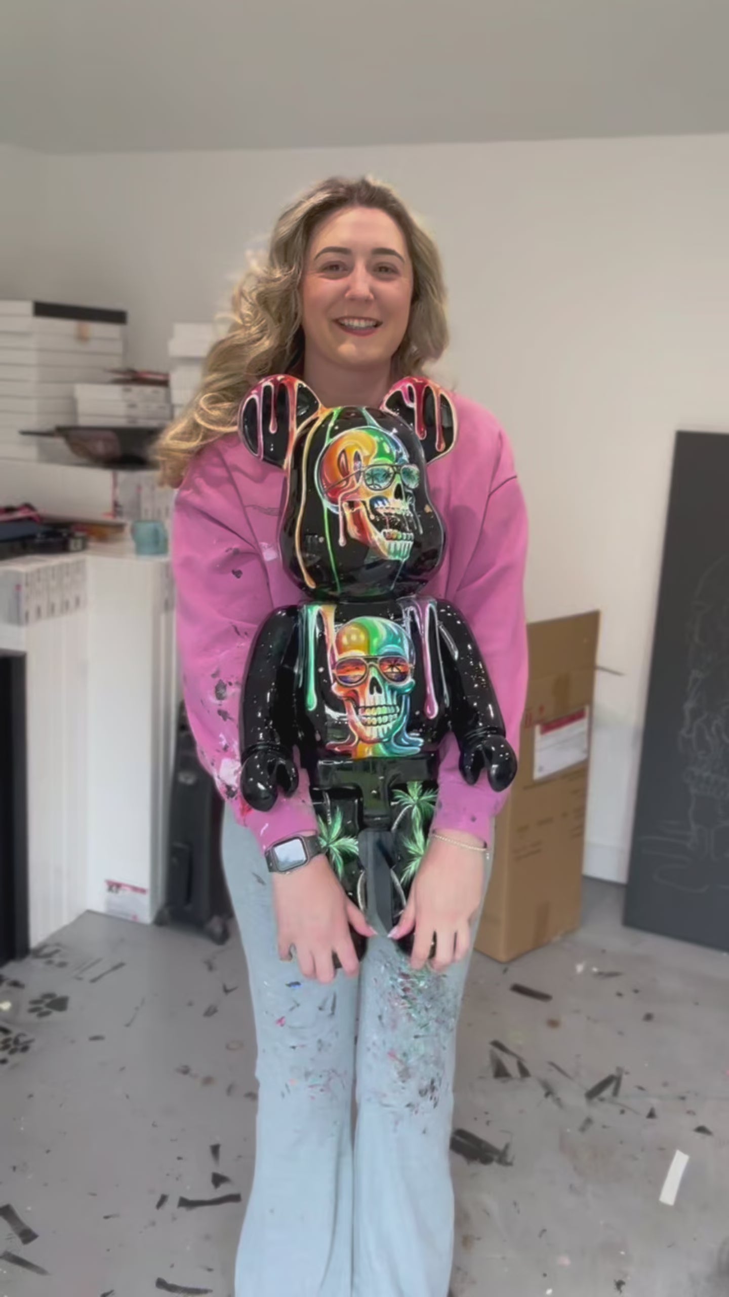 Becky Smith brings her iconic Marbella Collection to life in three dimensions with Tropic of the Dead, a one-of-a-kind Brick Bear sculpture, hand-painted in vivid acrylics and finished with her signature UV-reactive glow-in-the-dark pigments. Featuring her unmistakable rainbow skulls, tropical palms and glossy black backdrop, this artwork pulses with Becky’s bold colour, confidence and cultural crossover.