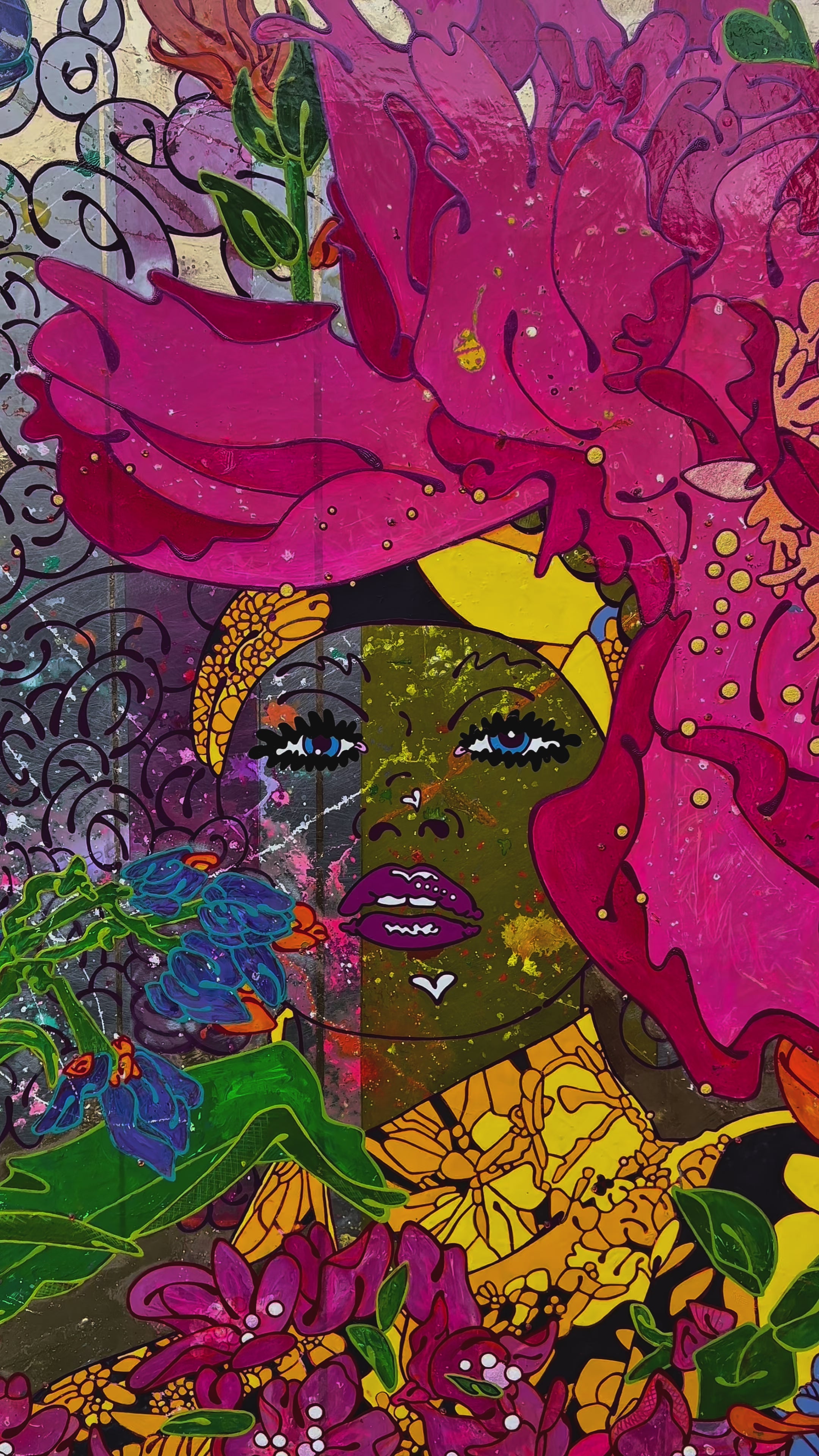 'A gorgeous explosion of blossoming blooms produced on layer upon layer of deliciously vibrant colour on a backdrop of luscious gold. What a sumptuous feast! In this new work, I wanted the plants to gain more prominence and as my practice has evolved, I'm now focusing more on depth of texture and strength of colour. Each individual petal is worked on, every section overlaid with more paint, then gently sanded back so what was once below can peep through. My works are as multi-layered as are we. A reflection of the lives we have led, the paths we have chosen, the trauma we have experienced. How our loves and losses and all of life’s deliciousness and despair continue to influence the people we become.'