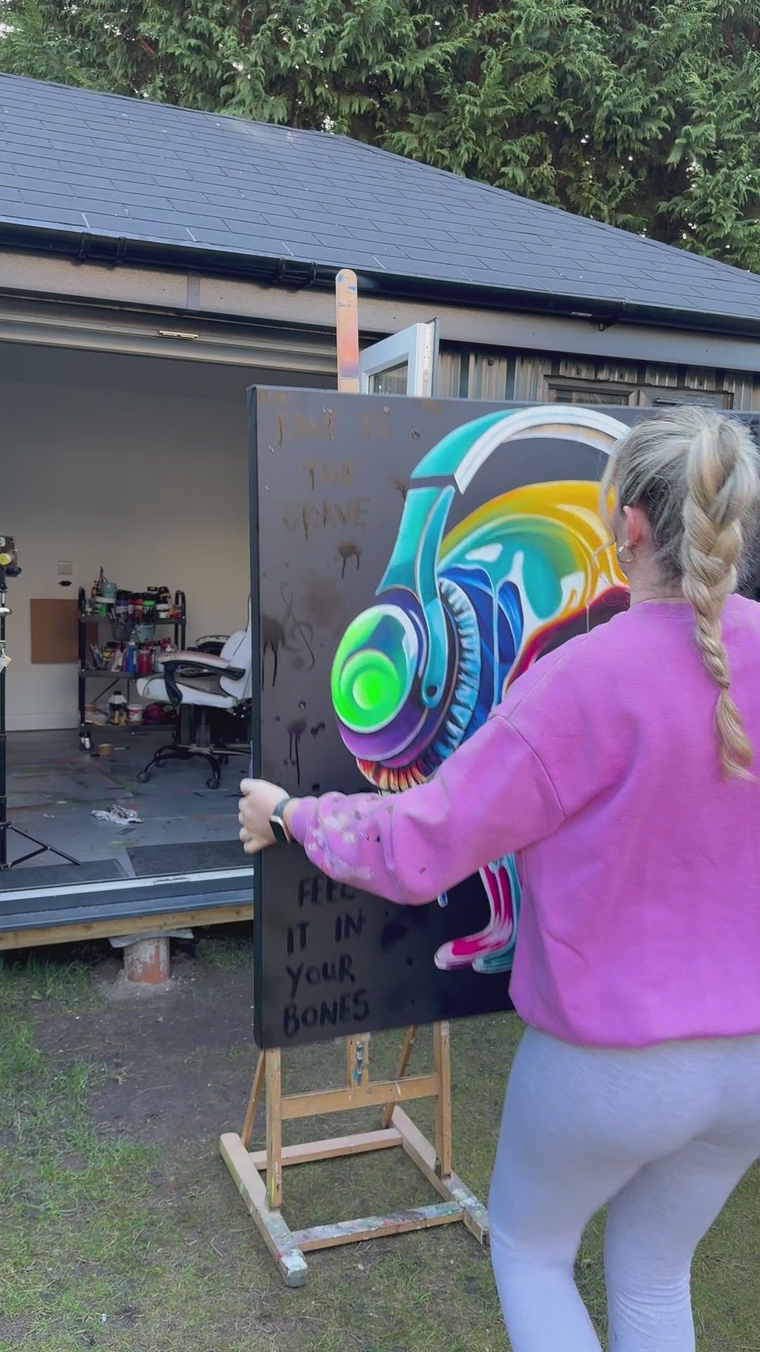 Bring the energy of the night into your home with "Rave To The Grave," an original masterpiece by renowned artist Becky Smith. The artwork showcases a dynamic, colourful skull adorned with headphones, dripping with lively hues that transform under UV light.