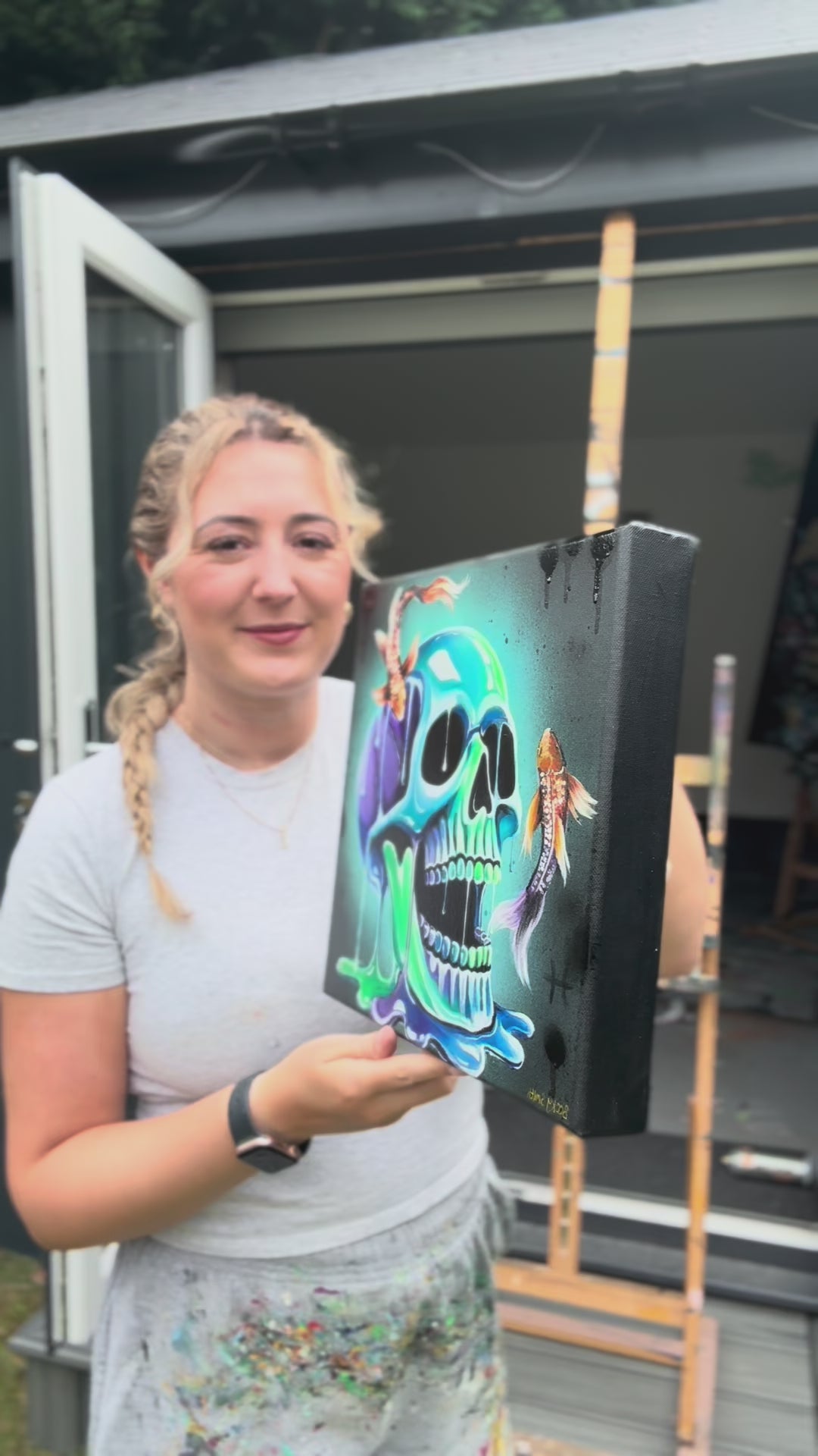 Becky Smith’s Skull of Pisces captures the zodiac’s most intuitive sign through dreamy hues and flowing movement. Two koi-like fish swim across a dripping turquoise skull, framed by oceanic blues, purples and a graffiti-style ♓ symbol. This soulful, mystical piece embodies the Pisces love of escapism and imagination. Finished with a luminous glow-in-the-dark effect, revealing hidden depth as night falls.