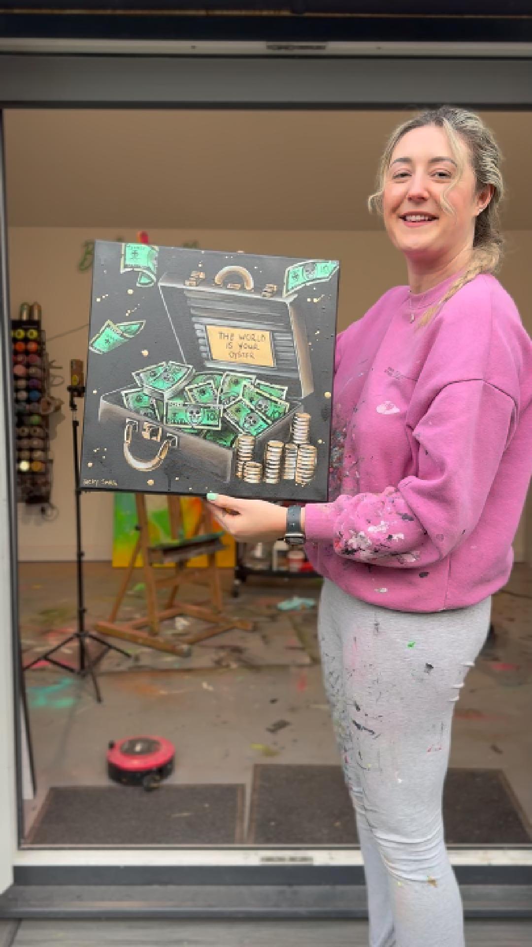 A celebration of confidence, possibility and playful ambition, The World Is Your Oyster is an original from Becky Smith’s Viva La Vida Marbella Collection. Featuring a metallic briefcase bursting with custom skull-stamped dollars and stacks of coins, this piece reimagines the classic power symbol through Becky’s signature lens of optimism and joy.