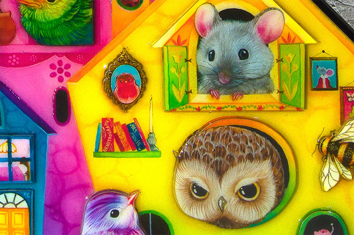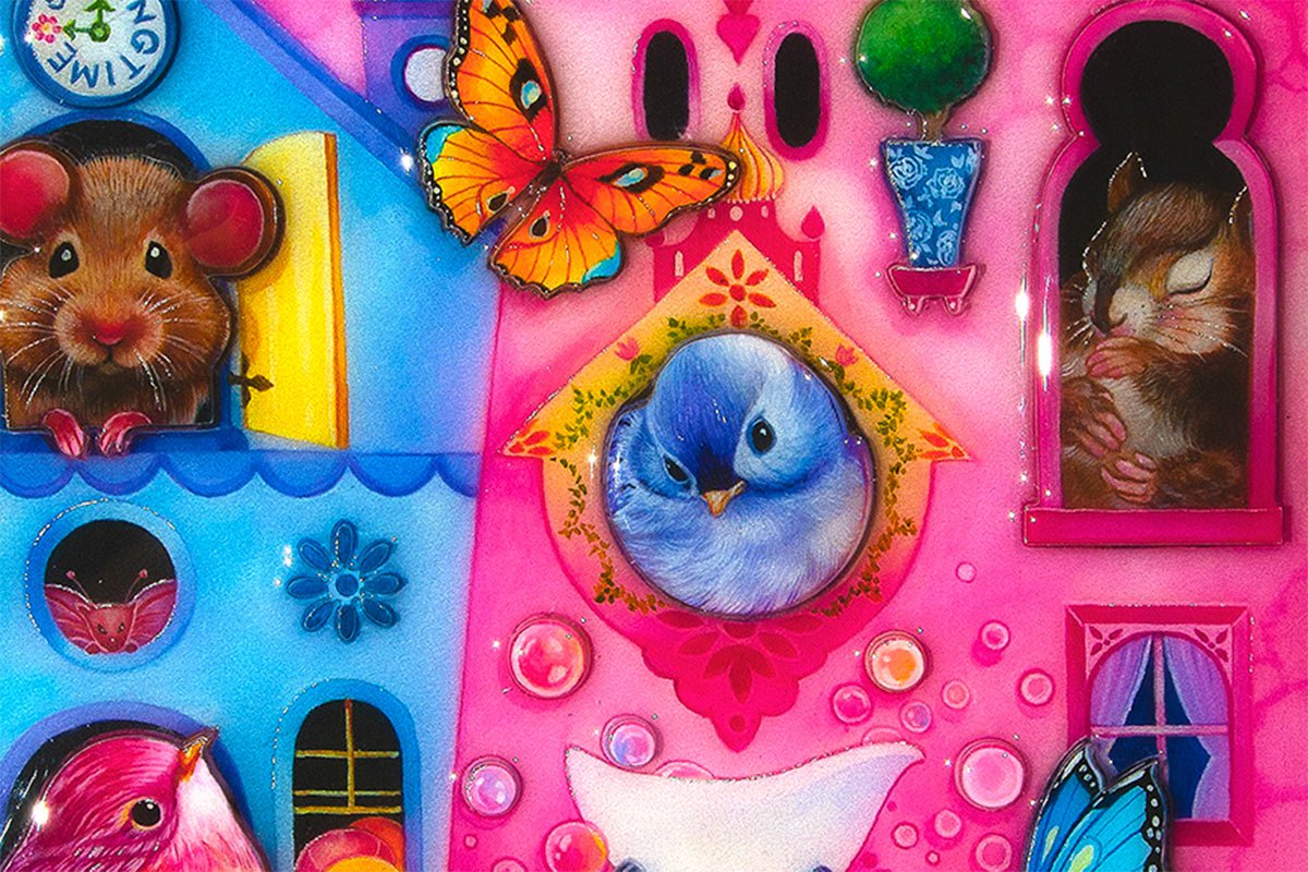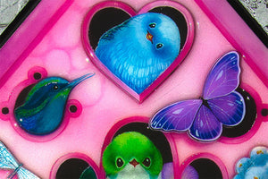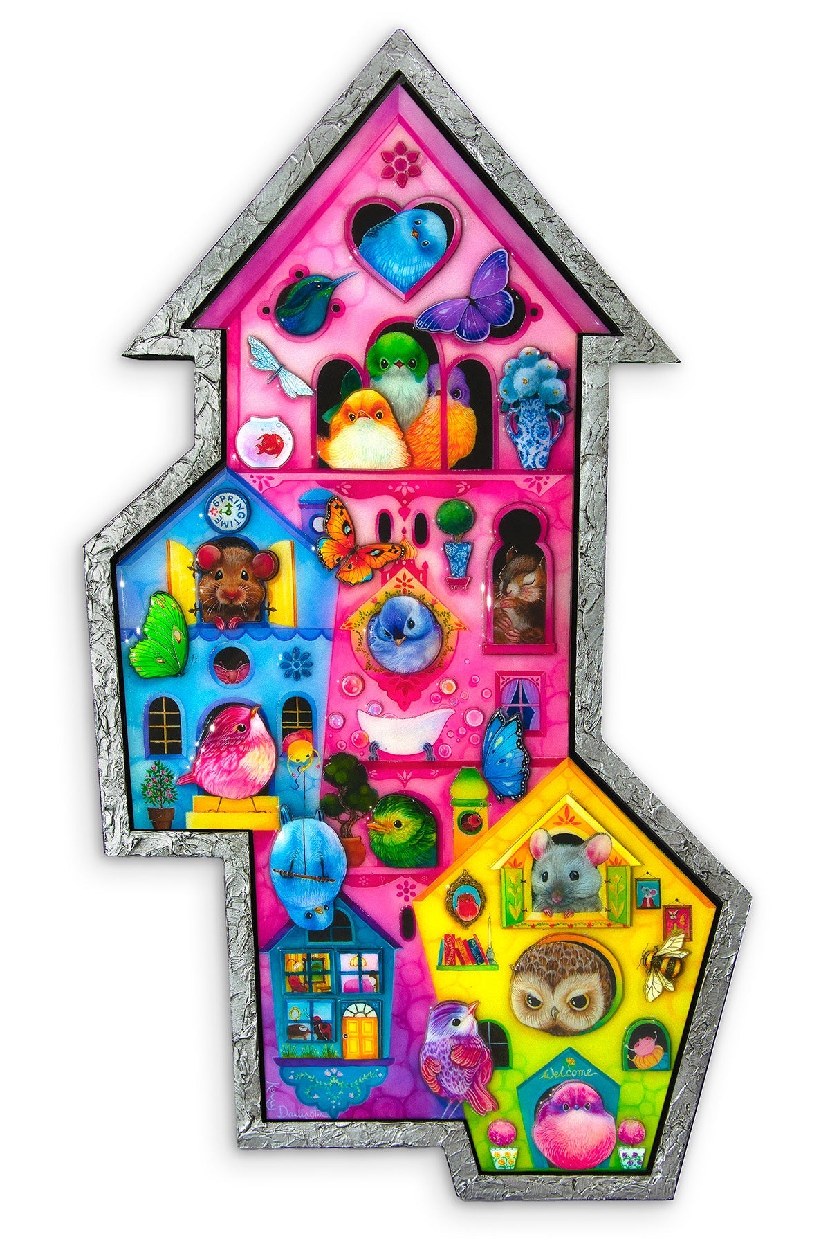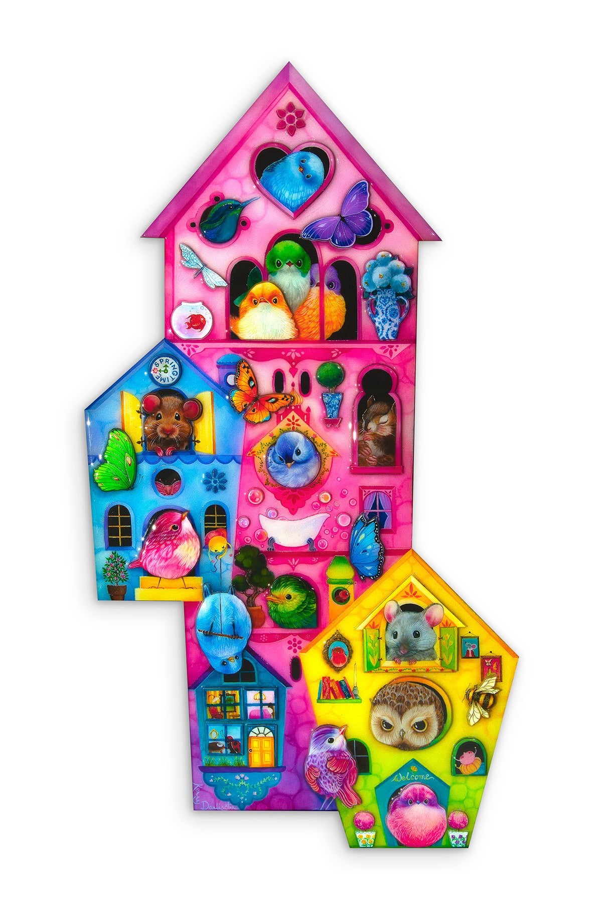 Hand-finished with sculptural 3D embellishments and sealed with her signature gloss resin, each piece captures the joyful movement of birds, butterflies, and woodland life. The shaped silhouette adds a dynamic, sculptural presence that brings the artwork to life from every angle.