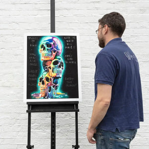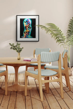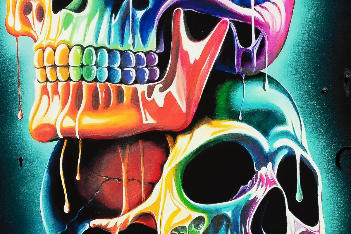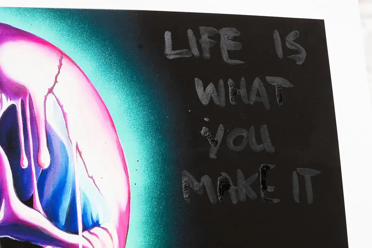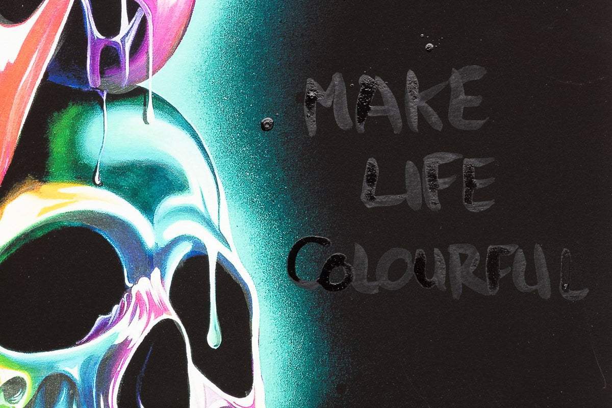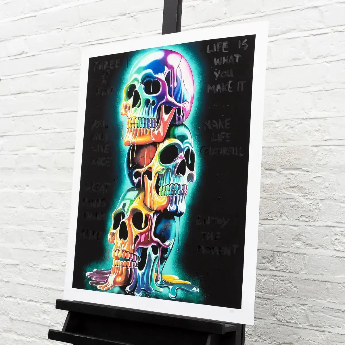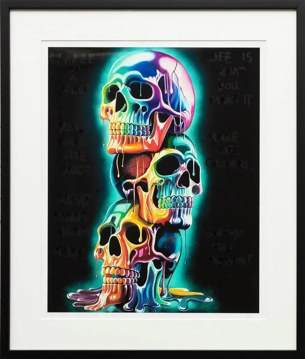 Bring colour, symbolism, and unmistakable Becky Smith energy into your space with Three of a Kind, a vibrant limited edition giclée print on museum-grade Hahnemühle fine art paper. Celebrating bold individuality and creative synergy, this striking artwork features a trio of vividly rendered skulls, adorned with Becky’s signature neon drips, graffiti elements, and positive affirmations like “You Only Live Once” and “Make Life Colourful.”