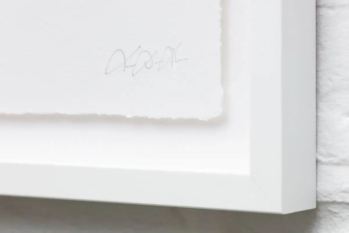 Upon arrival in our Weybridge showroom, each new arrival is examined by the studio & dispatch team. Frames are scrutinised for a perfect finish: glass is polished to perfection with anti-static art cloths. Auxiliary features like the string/wire and certification on the reverse are checked for positioning and correct mounting. Finally, the work itself is inspected to ensure a flawless transition from studio to gallery. Upon purchase, the work is cleaned again and meticulously subjected to our trademark 12-point checking system to ensure a safe secure journey to its ultimate destination.
