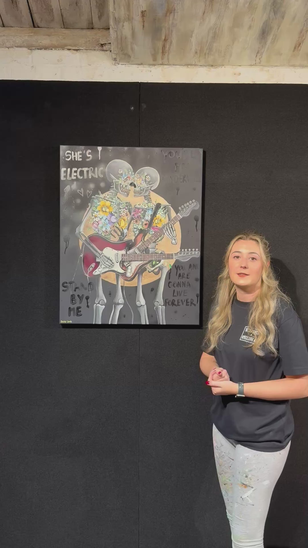 Turn it up loud! Becky Smith's She’s Electric Deluxe Canvas Edition brims with Oasis’s playful bravado. Skeleton lovers clutch their guitars in a riot of florals, set against a golden halo that radiates pure stage presence. Cheeky, unpredictable and bold, the scene hums with the eccentric vibe of the lyrics, “she’s got a sister,” “she’s got a cousin,” and the knowing spark of a love that can’t be contained. Each edition is hand-embellished for depth and detail, with glow-in-the-dark touches that burst to life under UV light. A limited canvas for collectors who want their walls to sing with electric energy.