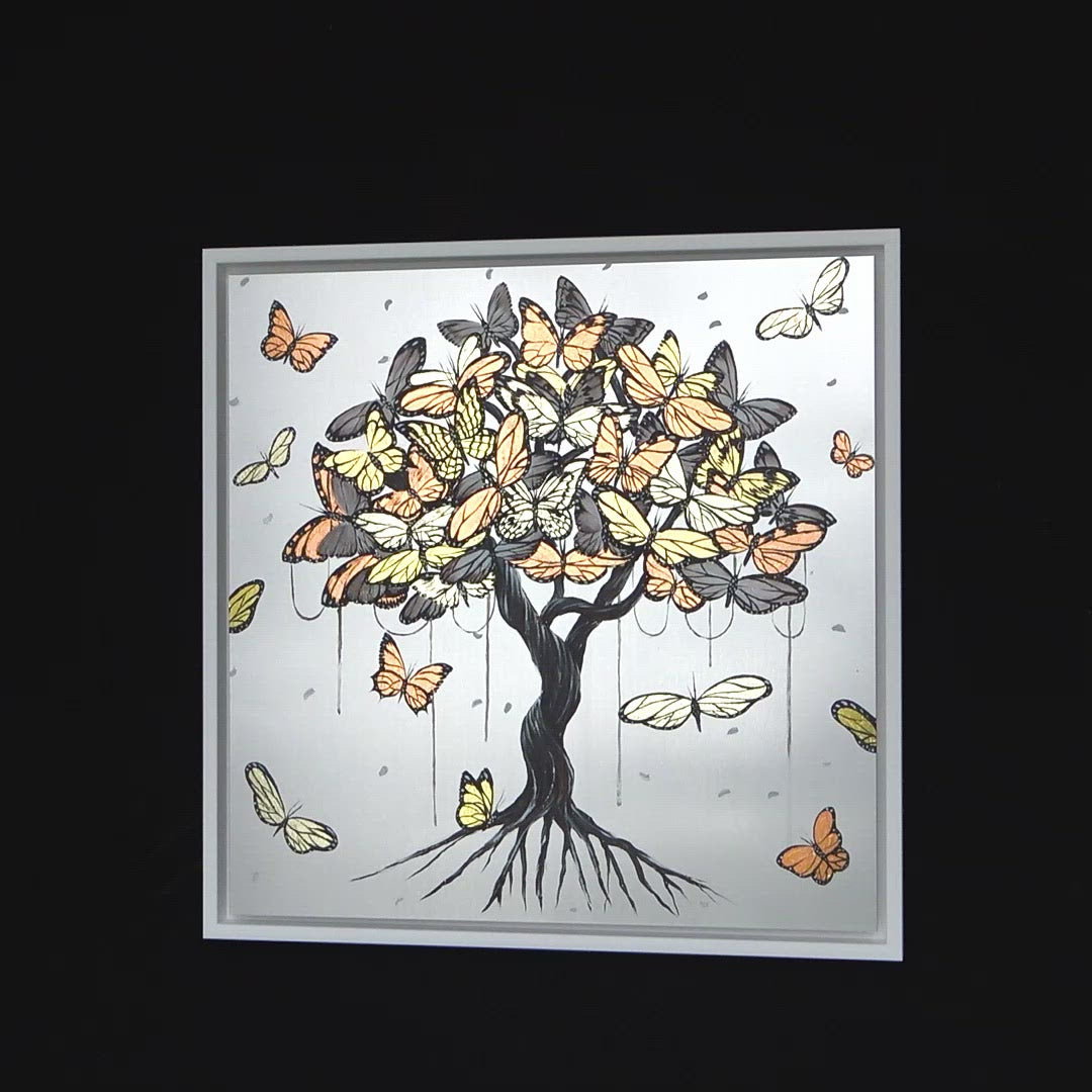 Laced with shimmering metallics, transform your home with the original work from the UK’s fastest rising star, Becky Smith. Painted upon a sheet of sleek aluminium and featuring her signature UV glow paint, butterflies soar into the air in this astonishing composition. Symbolising hope, renewal, and transformation, invite Smith’s positivity and purpose into your art collection today.