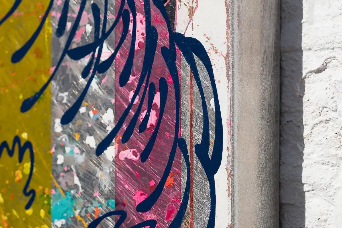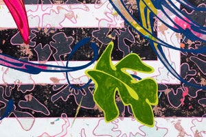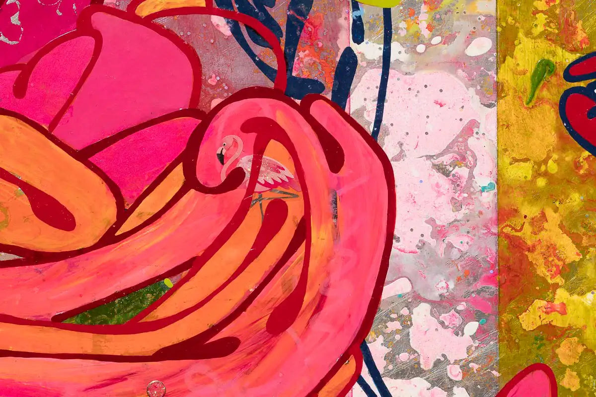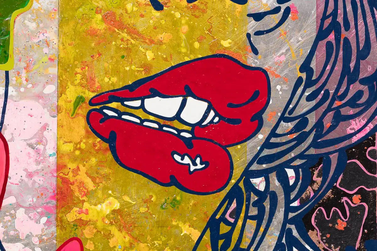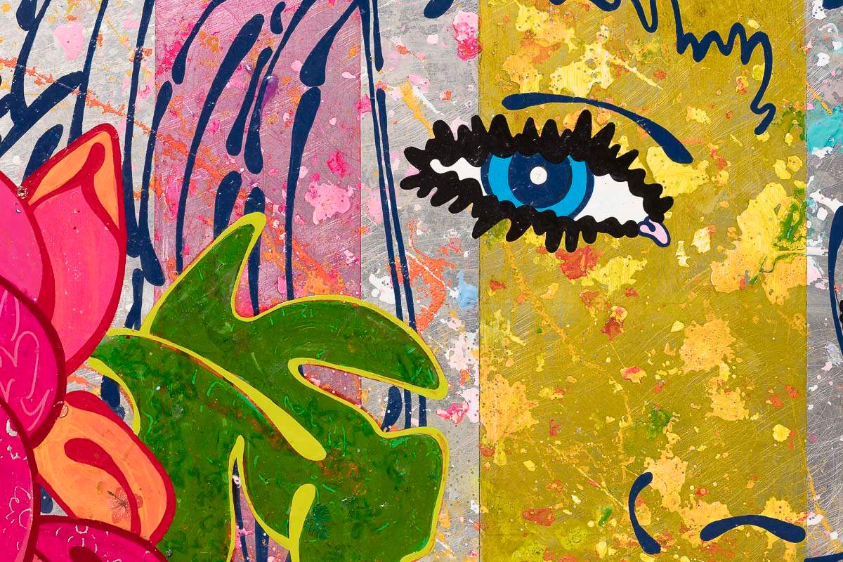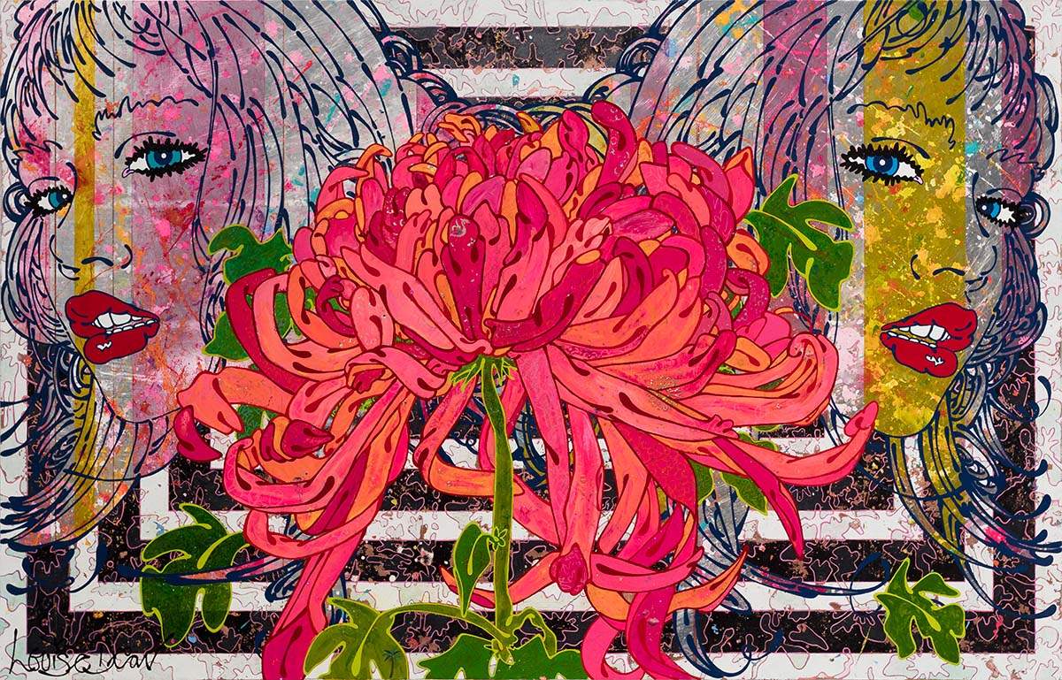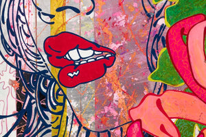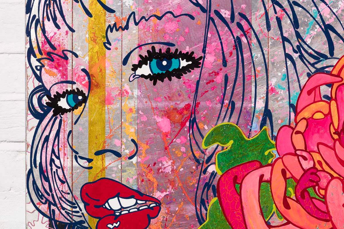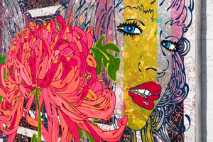 'Twins with a single pulsing heart gazing out from the canvas with 'knowing innocence'. They have the same intricate curls and glossy, plump red lips, only different-coloured eyes of piercing blue and teal suggesting that they are, in fact, independent beings. I first coated the background in copper leaf, carefully occupying all of the negative spaces to allow the image to pop from the canvas as though the decapitated forms are simply floating in space. This luscious leaf was then covered in my signature black and white stripes, rendered in contrasting textures, mattes and glosses in an intricate design of Japanese inspired blossom. The petals' independent form appears as butterflies or other creatures that inhabit the blooming buds. The paint has then been softly sanded back to allow the under layers to protrude giving the viewer glimpses of the inner depths and the shimmering lushness of the copper leaf. Look closely at the lush petals of the peony and you'll also spot small images and stickers that have been encapsulated inside the sealed bubble of the varnish - all symbols of my world, flamingos, sunshine and sparkles.'