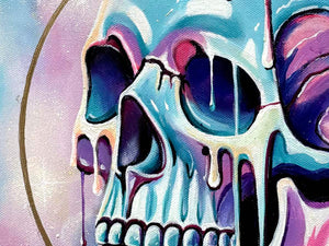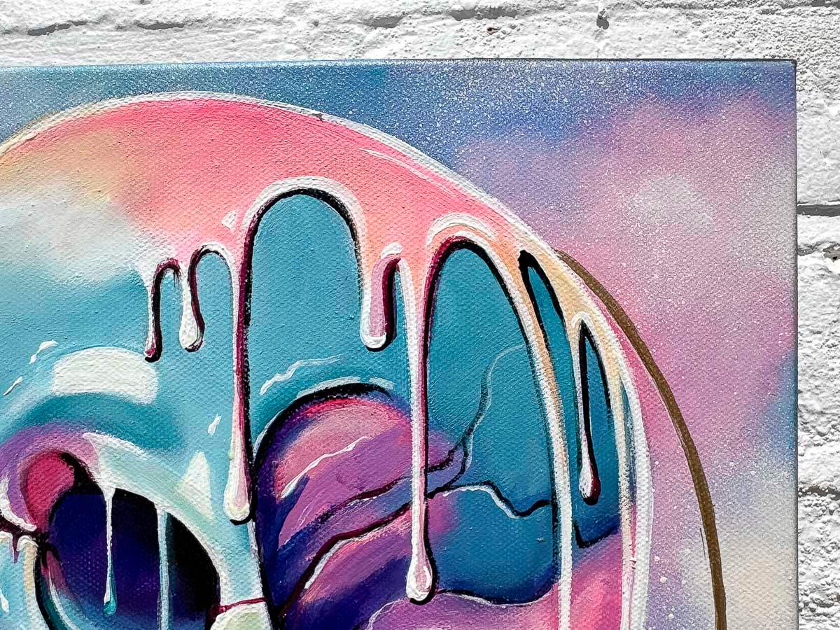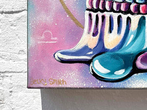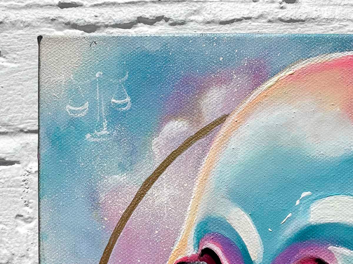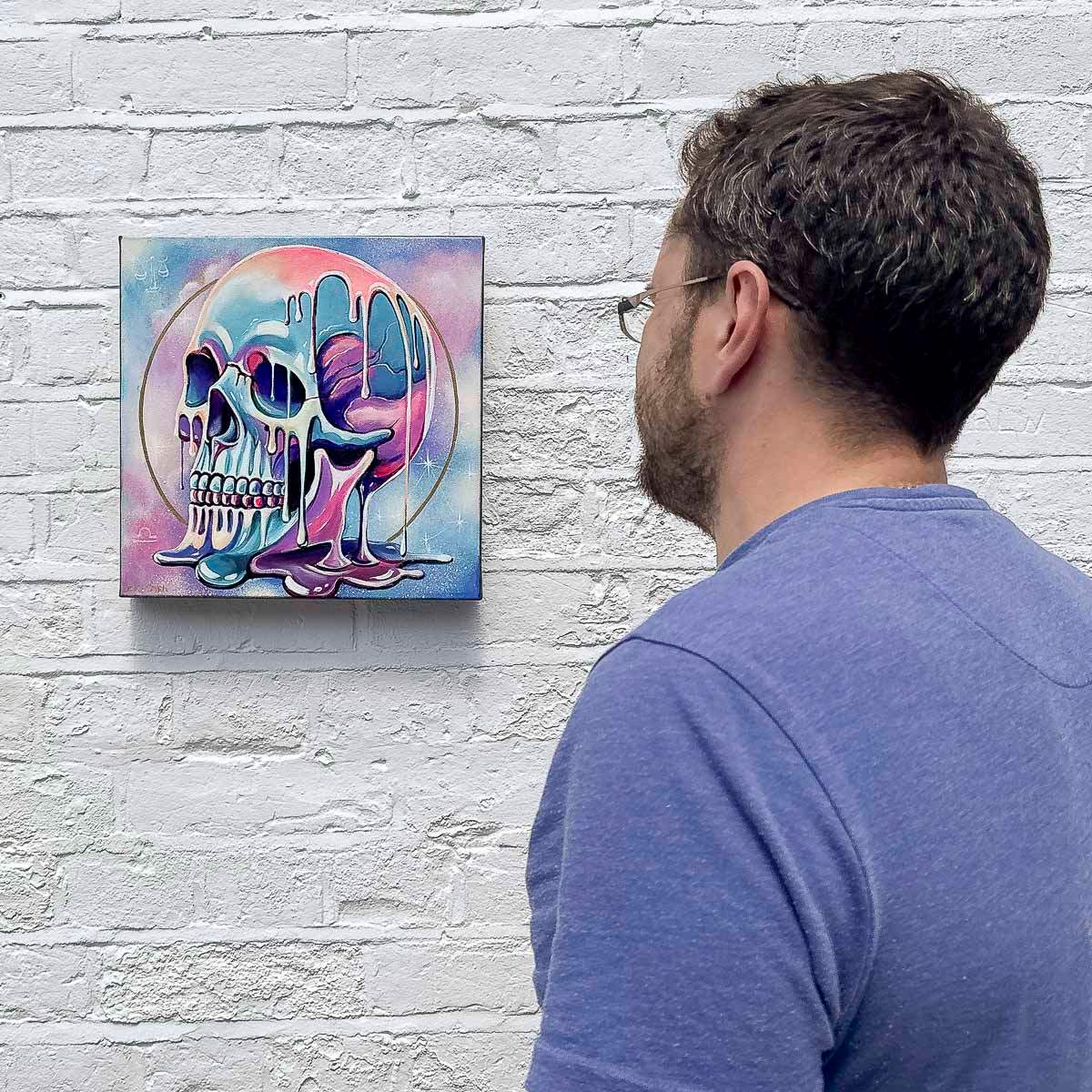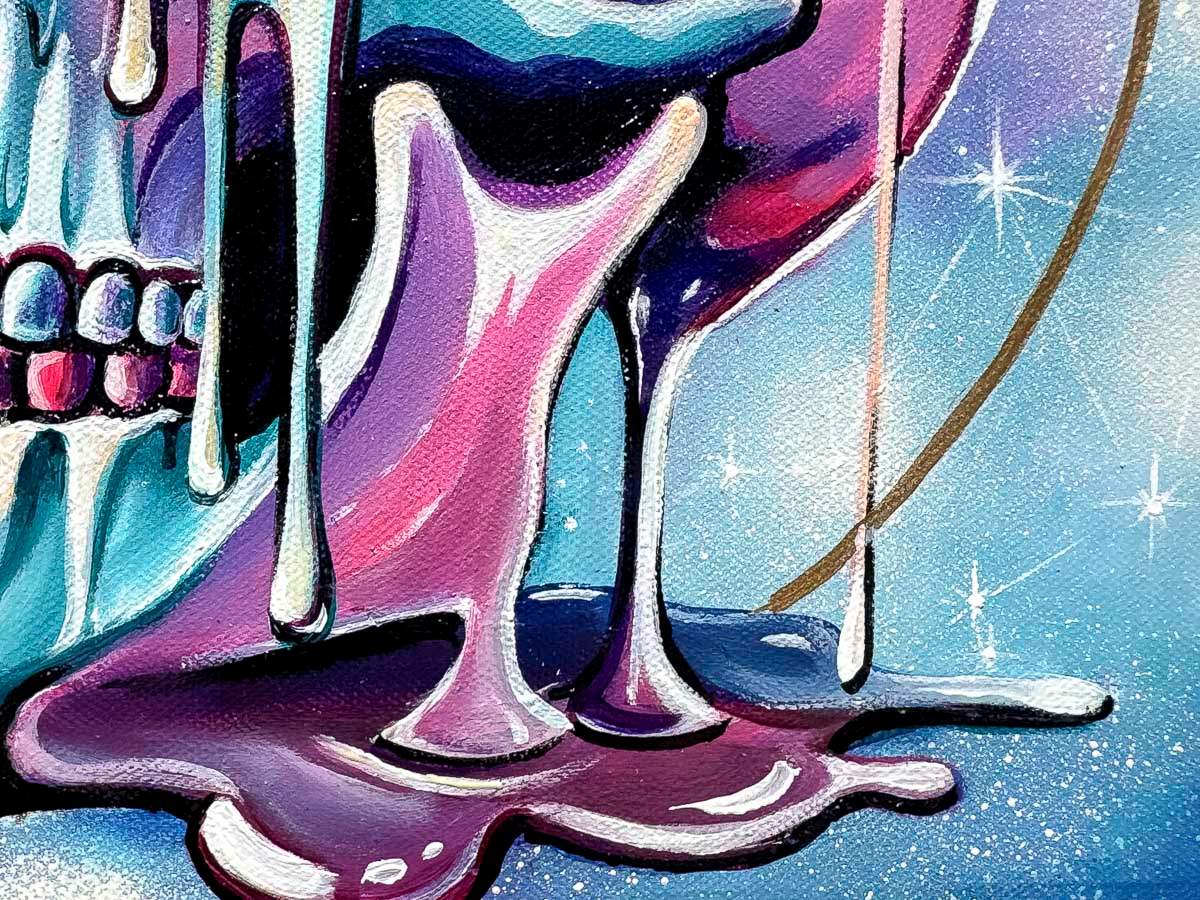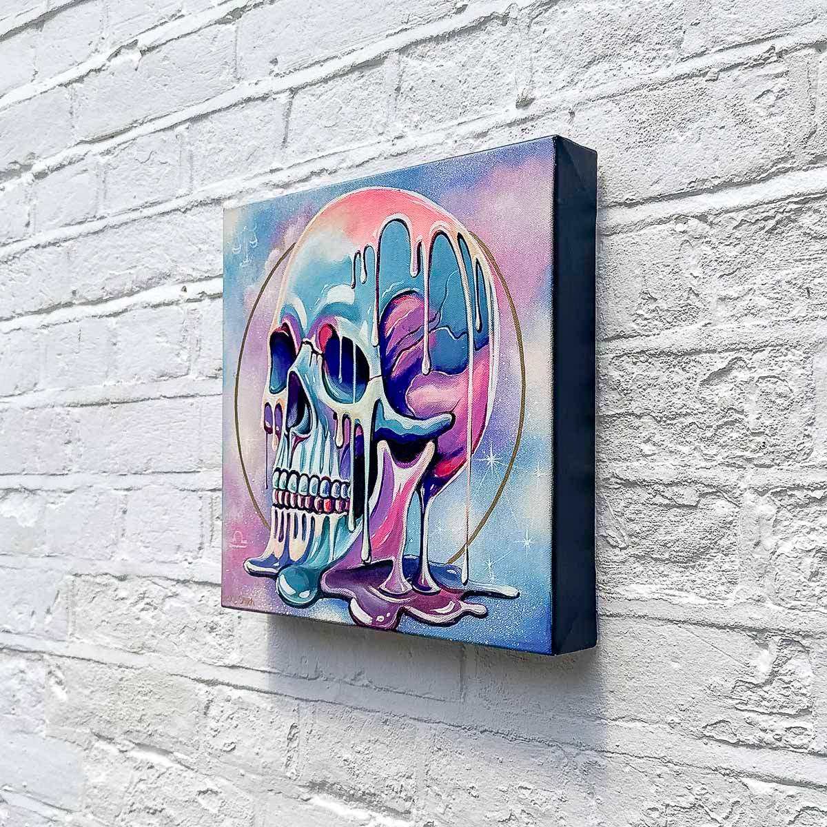 Becky Smith’s Skull of Libra blends dreamy pastel tones with an ethereal galaxy backdrop, inspired by the elegant air sign. Gold accents form the scales, constellation and iconic ♎ symbol, reflecting Libra’s love of beauty and balance. Fluid drips and candy-like hues create a visual harmony unique to this sign. Glows brilliantly in the dark, unveiling an entirely new dimension once the lights go out.