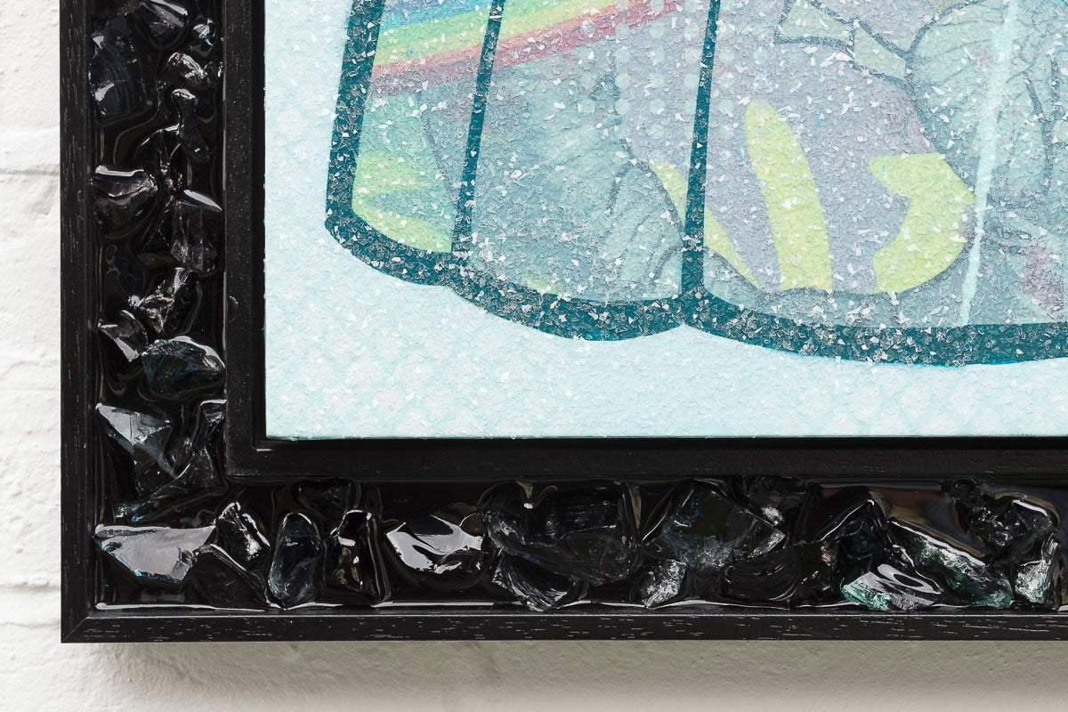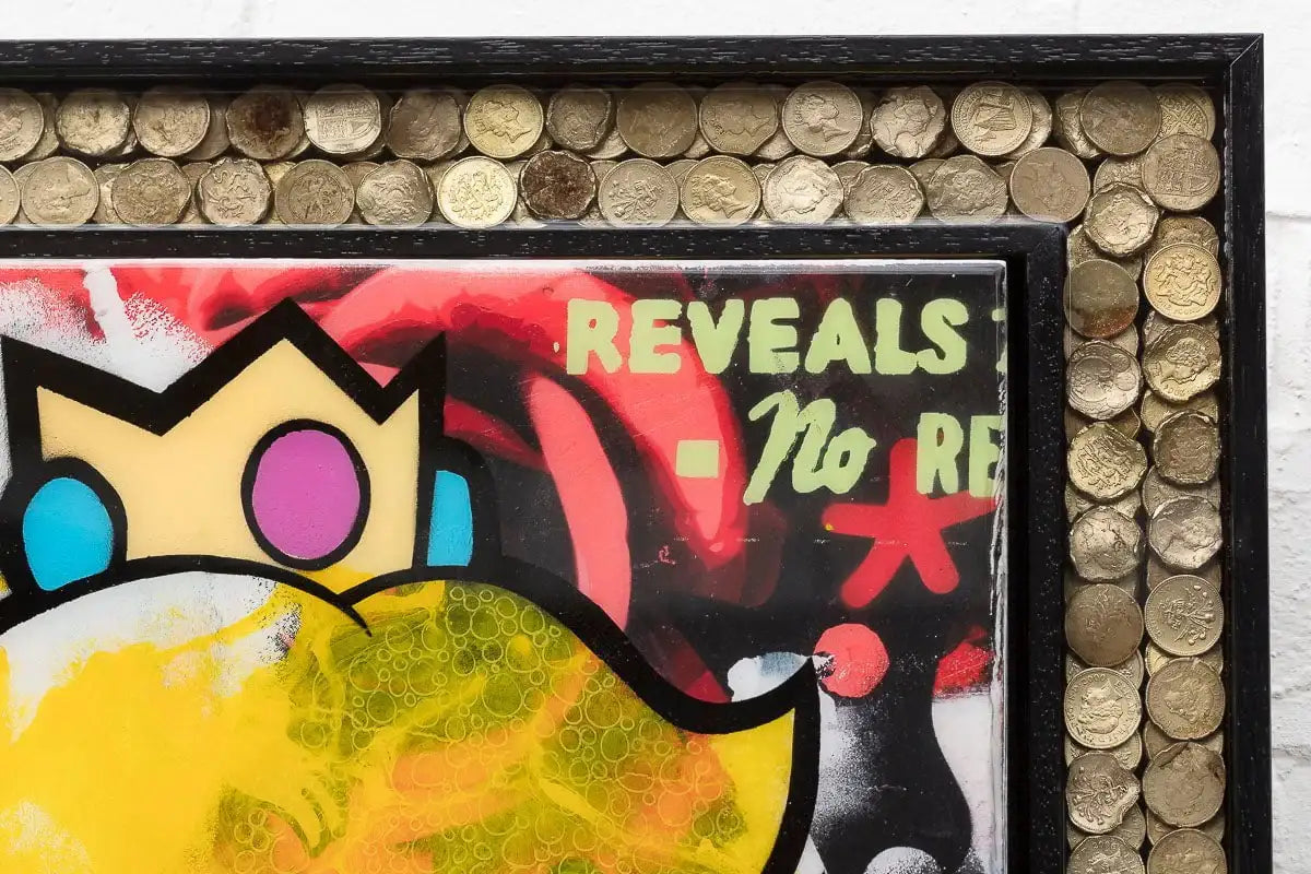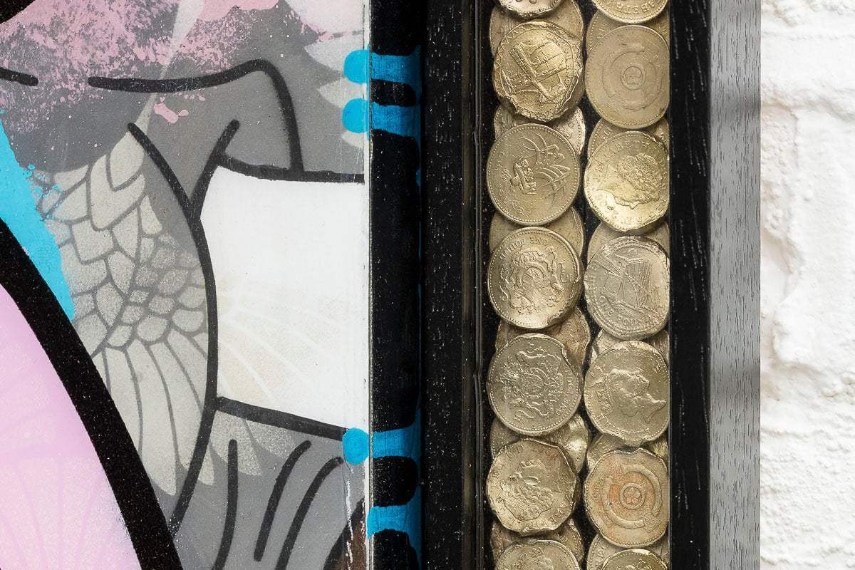 • Frame: Set in a custom made hollowed black tray frame filled with broken glass, found pound coins and cast in a high gloss resin.