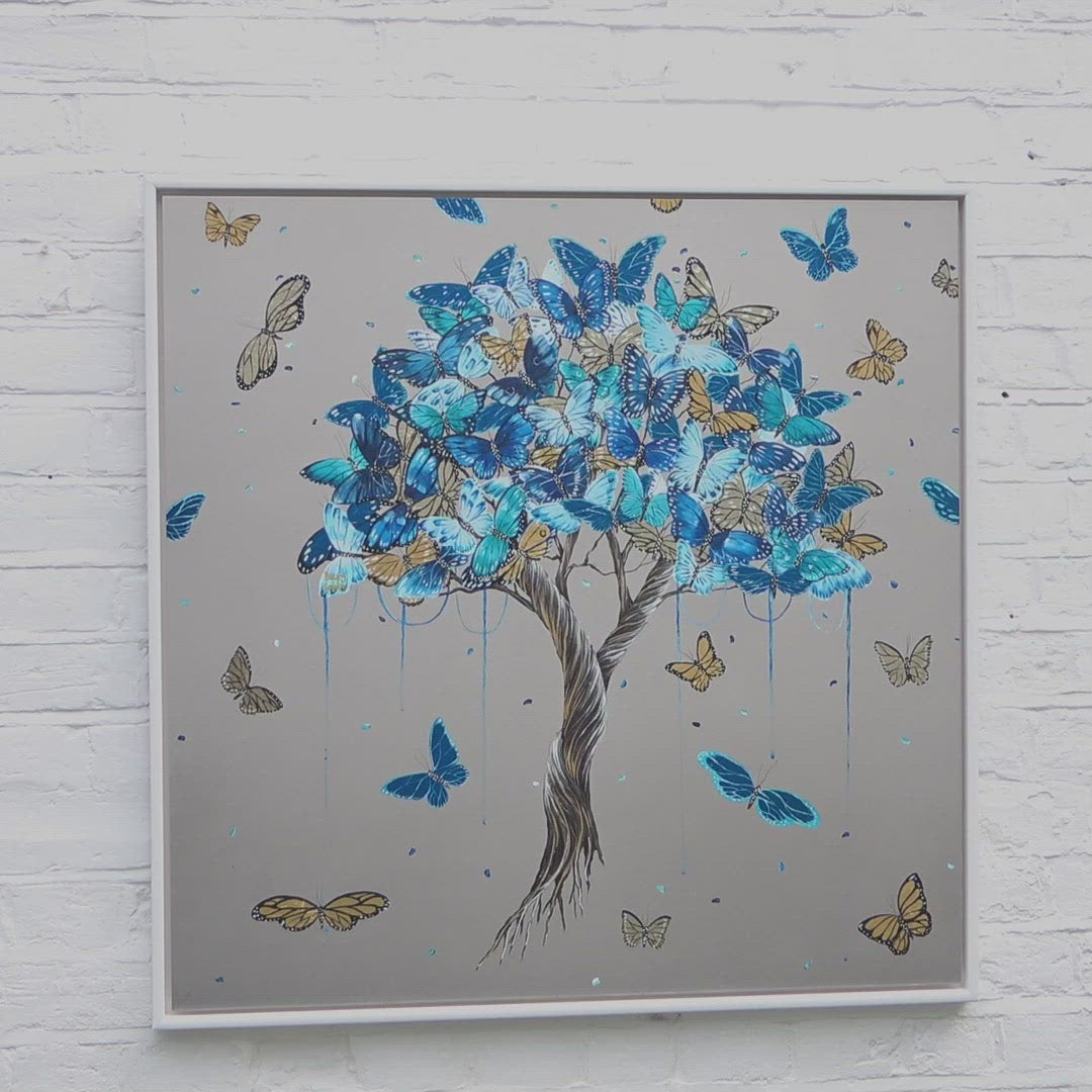 Her distinctive techniques, including layering acrylic paints and aerosol sprays with metallic leaf on canvas. Smith's use of UV-reactive pigments transforms her artworks from day to night, offering a glowing second life after dark. Exclusively available at Wyecliffe Galleries.